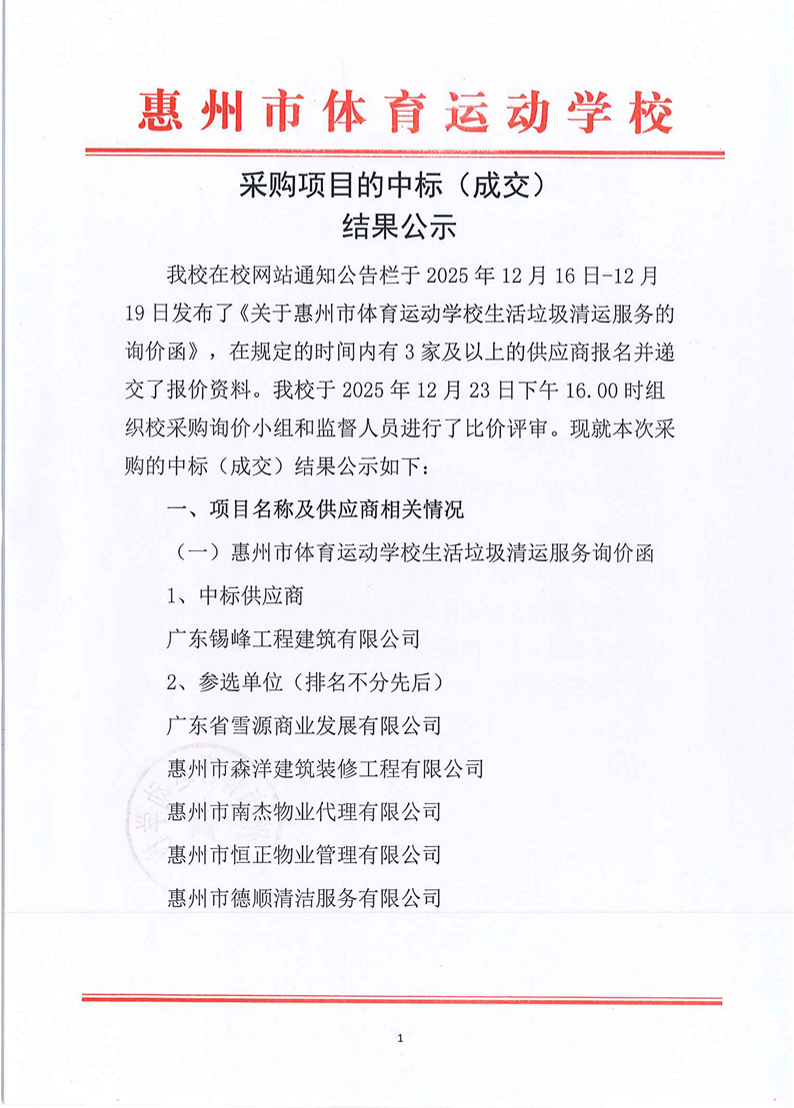关于惠州市体育运动学校生活垃圾清运服务采购项目的中标(成交)结果公示