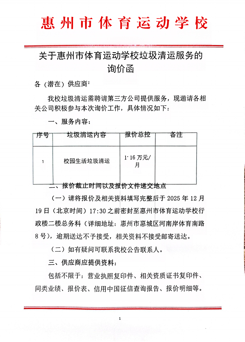 关于惠州市体育运动学校垃圾清运服务的询价函
